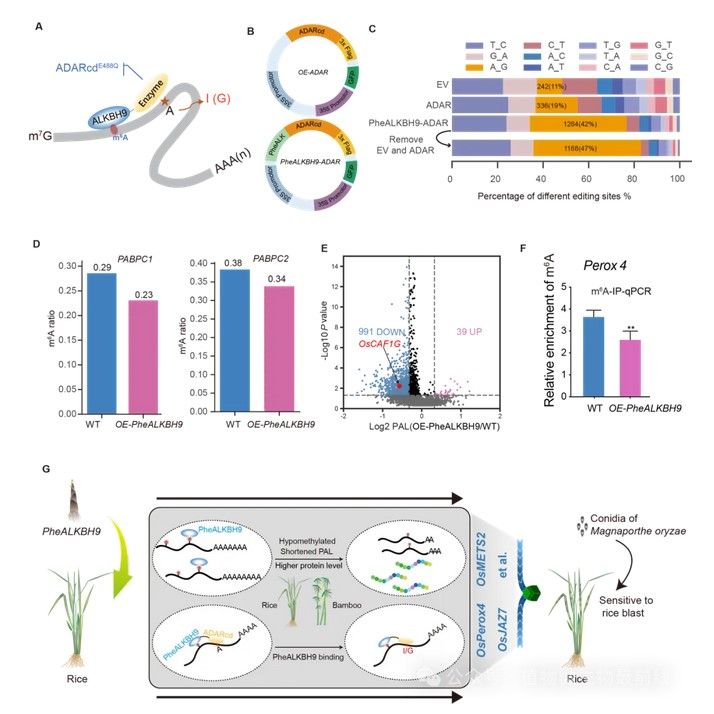 本研究鉴定了毛竹的m6A去甲基化酶PheALKBH9,证实了其擦除m6A修饰的功能,并发现PheALKBH9 调控植物对生物胁迫的响应。为揭示其调控机制,本研究通过HyperTRIBE (Targets of RNA-binding proteins Identified By Editing)技术 (图1),将RNA编辑酶(ADARcdE488Q)与PheALKBH9的C端进行融合,在过表达材料中根据RNA上腺苷(A)转变为肌苷(I)的编辑事件,揭示了PheALKBH9在毛竹和水稻中结合的靶标RNA,并发现在禾本科中存在一定的保守性。PheALKBH9可直接结合CAF1G和PABPC1及PABPC2的转录本,解释了PheALKBH9过表达所导致的基因整体的poly(A)尾巴长度变化原因。特别是发现PheALKBH9可与抗病相关基因Perox4的转录本结合,并去除其m6A修饰,提升Perox4的基因表达与蛋白表达,从而影响生物胁迫(图1)。本研究揭示了毛竹m6A去甲基化酶PheALKBH9在植物响应生物胁迫过程中的关键作用,为利用毛竹m6A修饰功能基因进行禾本科植物的遗传改良提供了重要的理论依据。